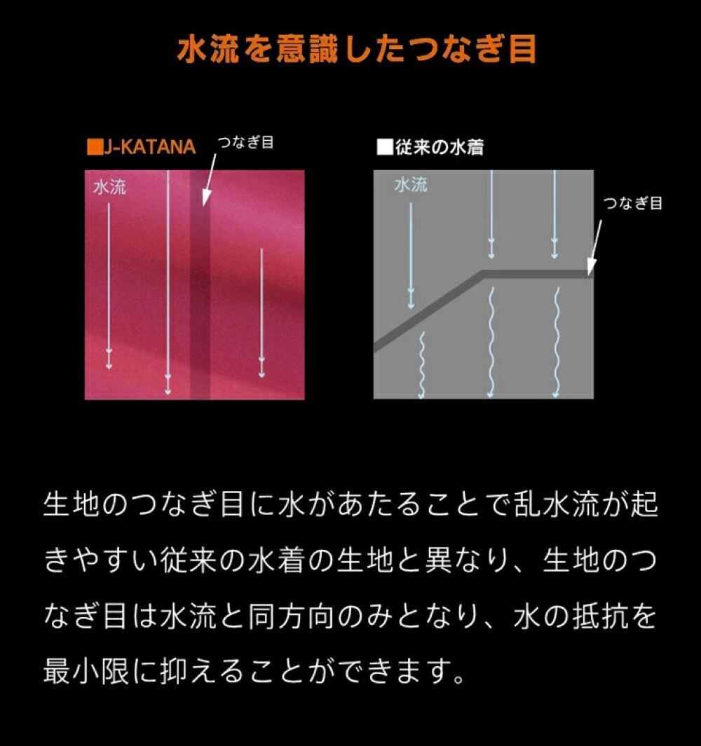 水流と同方向に設計されたシーム(縫い目)と超繊細フィラメント糸によるフラットな表面構造が水の抵抗を徹底的に軽減。