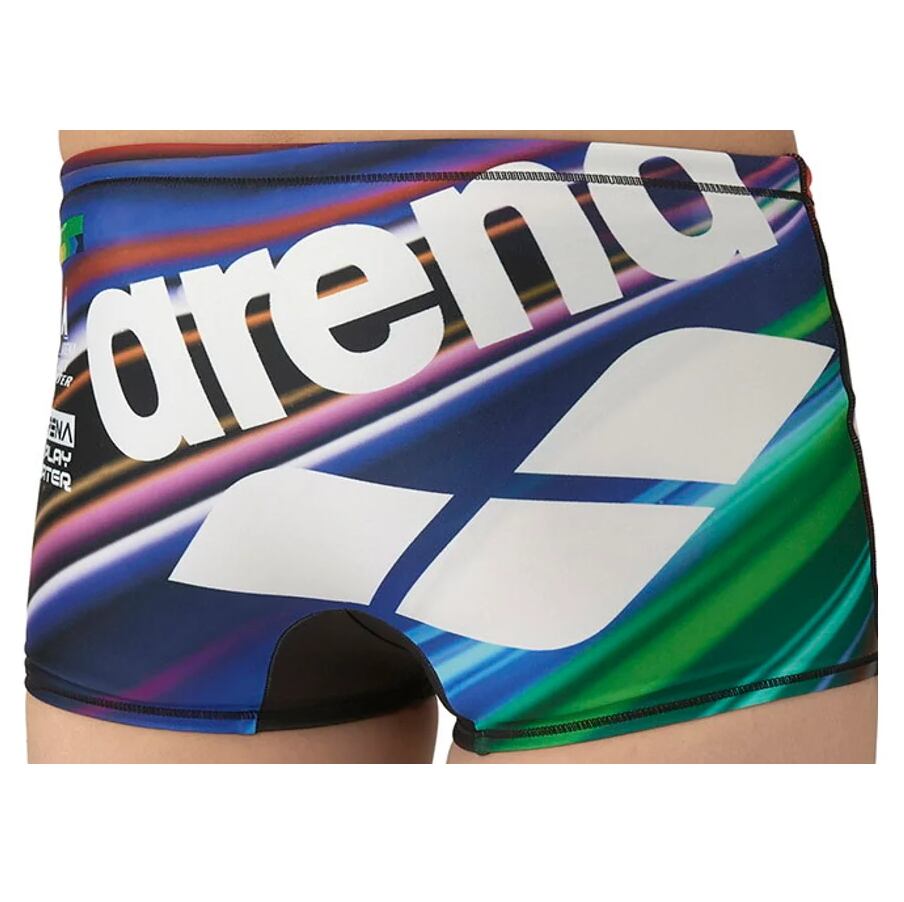 アリーナロゴが左腿に配置されたデザインの練習水着。