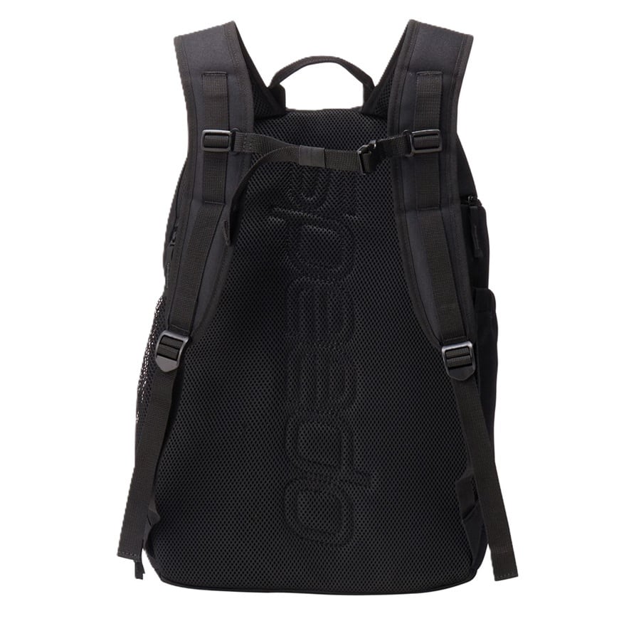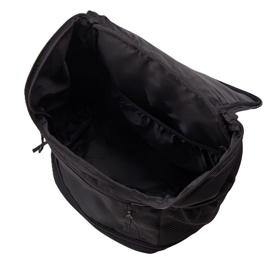 手前に大きく開くメインファスナーは、かさばるトレーニンググッズの出し入れに便利です。底面にはシューズポケット、サイドには保冷シート付ポケット、水筒も収まるゴムつき口のポケットを装備しました。